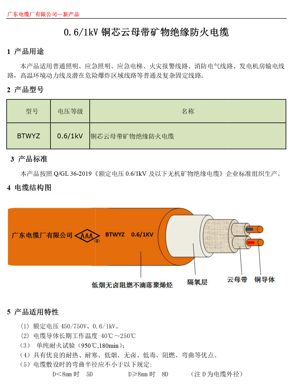 BBTRZ 0.6/1kV 銅芯云母帶礦物絕緣防火電纜